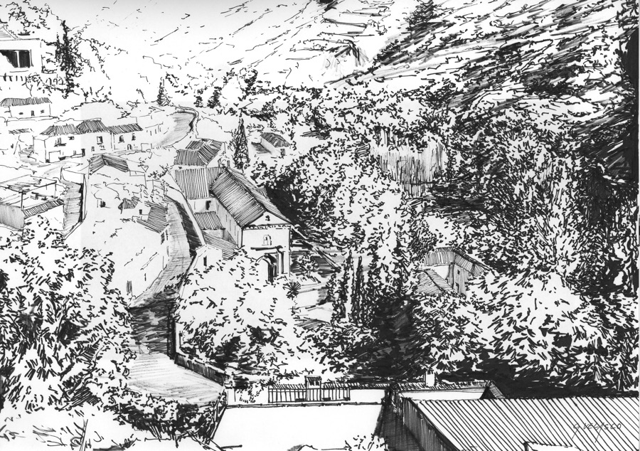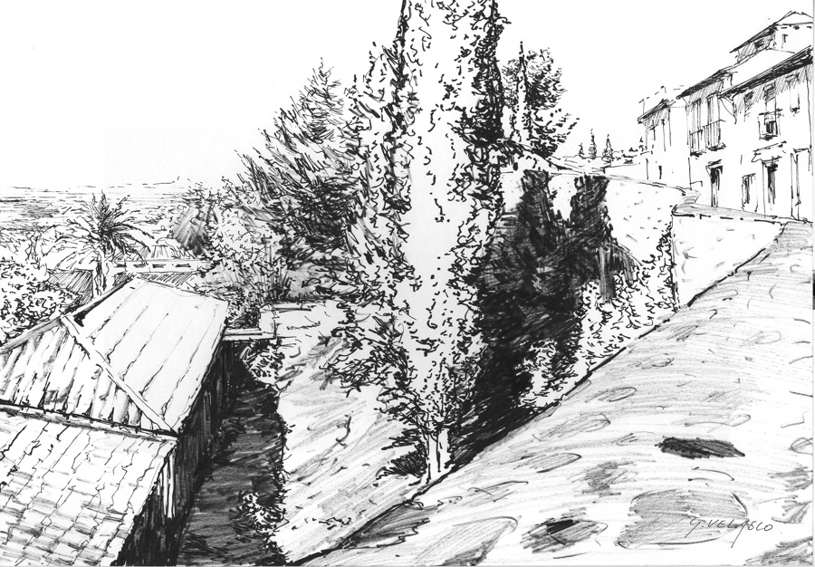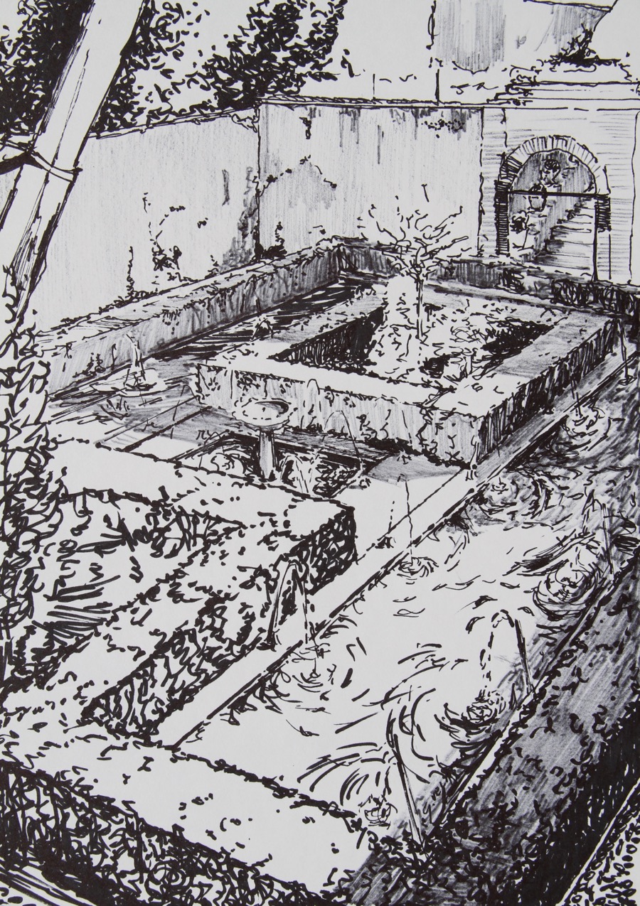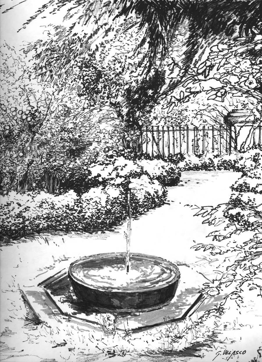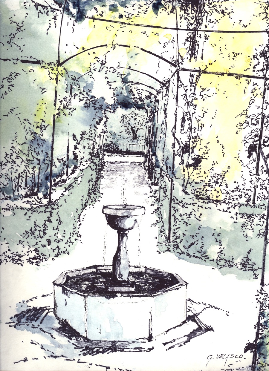 Líneas trazadas de sombras y luces que construye la diversidad de un lugar, espacio abierto, rincón íntimo, sendero zigzagueante, recodos imprevistos, senderos floridos, un hilo de agua que fluye a ras del suelo y se matiza con toda la gama de la espesura, y se vierte en el mármol de un surtidor.